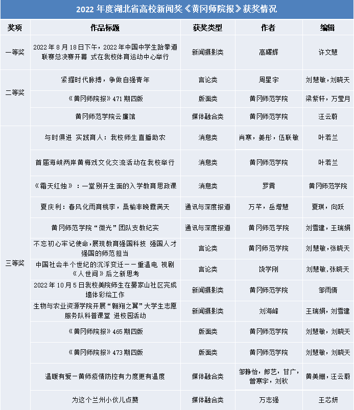 近日,2022年度湖北省高校新闻奖评选结果揭晓,公司师生两件作品荣获2022年度湖北省高校新闻奖一等奖和三等奖。