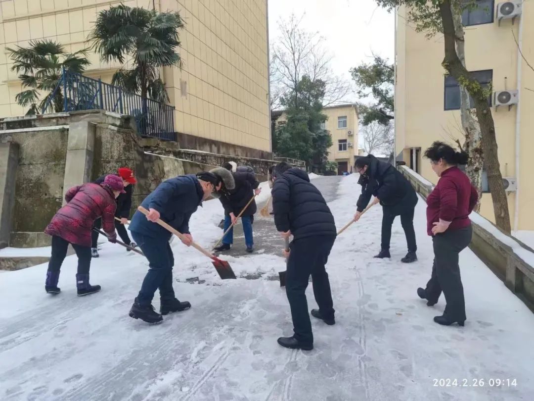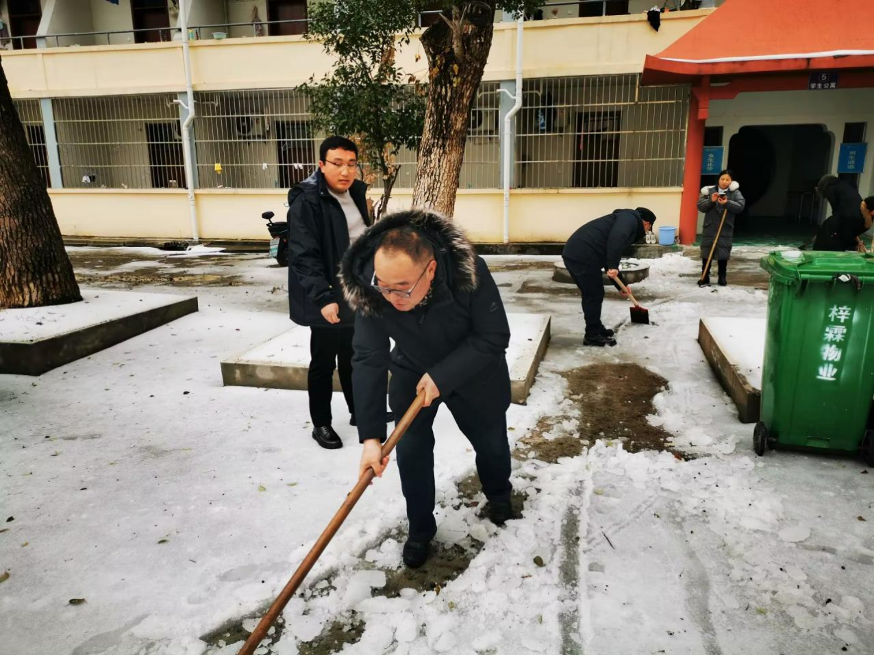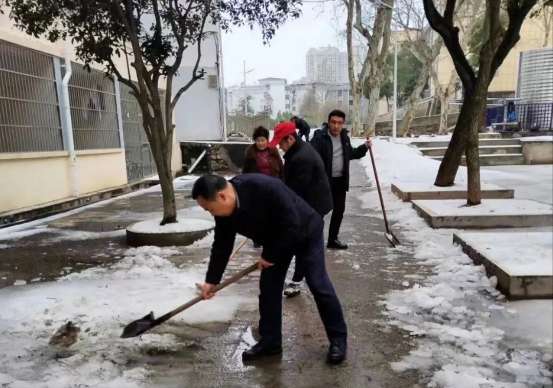 校园冰冻厚厚积雪,公司班子成员、老师齐心协力,分工合作,一部分人负责碎冰,一部分人负责铲雪,一部分人负责清运,整个过程高效有序,为返校员工清扫出一条“暖心通道”。
