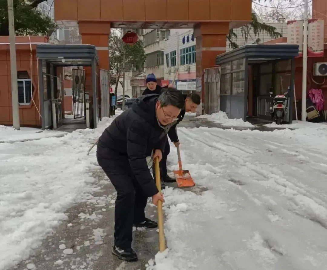 虽然天气严寒,路面湿滑,但丝毫没有影响大家的热情。清理路面积雪、铲除路面冰层,大家分工合作,齐心协力,快速有序地清理道路积雪。校门口、主干道、图书馆、员工公寓、食堂、超市等,只要是师生活动能覆盖的区域,都回荡着除雪工具与地面碰撞声。经过大家共同努力,西校区内外豁然开朗,原本冰雪覆盖的道路变身为一条条充满温情的“安全通道”。行动是最好的融雪剂,全体教职工用行动“融化”冰雪,清扫出了宽敞的“平安路”,用实际行动为即将返校的师生送上公司的第一份温暖,用具体行为为风雪归来的学子上了暖心一课。